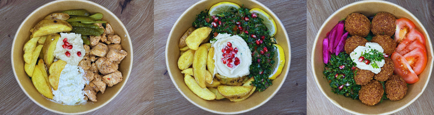 Taboulé (mélange de légumes frais finement coupés, boulghour), Hoummous (délicieuse combinaison de poix chiches et de crème de sésame), Frites.